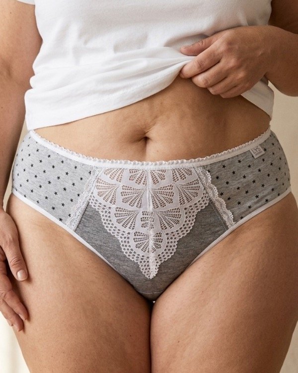 Esta bombacha en gris melange está confeccionada en algodón respirable y detalles de puntilla blanca que aportan frescura y feminidad. Ideal para todos los días, sin renunciar a sentirte linda y cómoda.