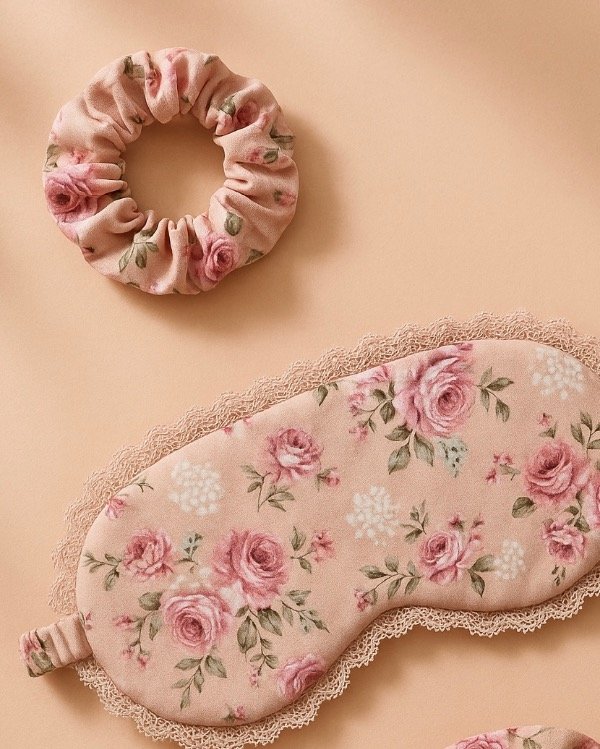 💞 Antifaz y scrunchie combinados, confeccionados con los mismos géneros suaves.