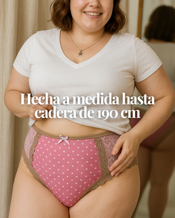para contornos de cadera desde 90 hasta 180 cm. Al no trabajar con talles estándar, cada prenda se confecciona a medida, garantizando un ajuste ideal. Solo necesitas coordinar video llamada para tomar juntas las medidas y disfrutar de una lencería hecha solo para ti. Llevan recorte y detalles de puntilla en el delantero