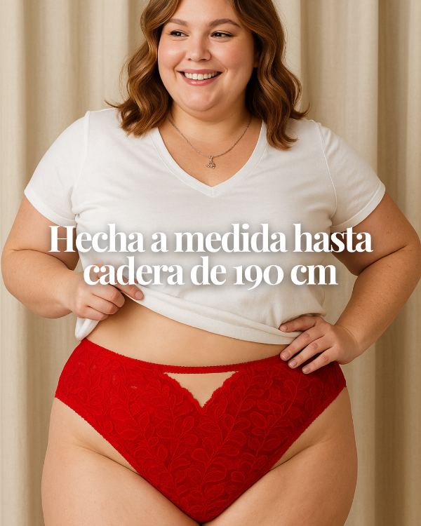 para contornos de cadera desde 90 hasta 190 cm. Al no trabajar con talles estándar, cada prenda se confecciona a medida, garantizando un ajuste ideal. Solo necesitas coordinar video llamada para tomar juntas las medidas y disfrutar de una lencería hecha solo para ti. Llevan recorte y detalles de puntilla en el delantero