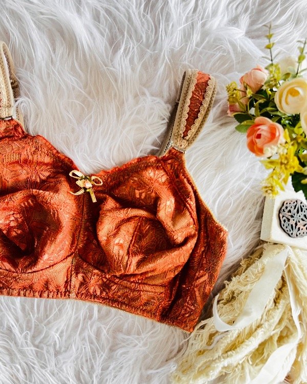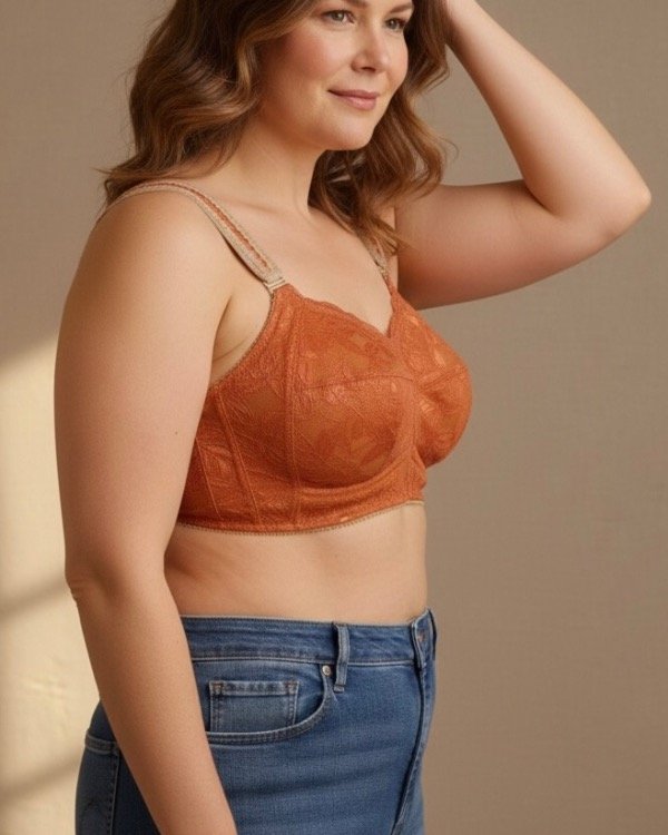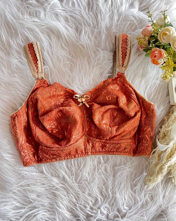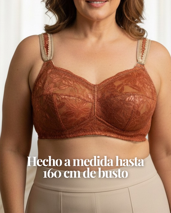 El Corpiño Amira está diseñado para mujeres que buscan máximo sostén sin aro, suavidad absoluta y una estructura que realmente acompaña el peso natural del busto. Confeccionado en encaje floral resistente con brillo terracota y forrado íntegro en algodón, es la opción ideal para quienes necesitan comodidad extrema sin renunciar a la belleza.